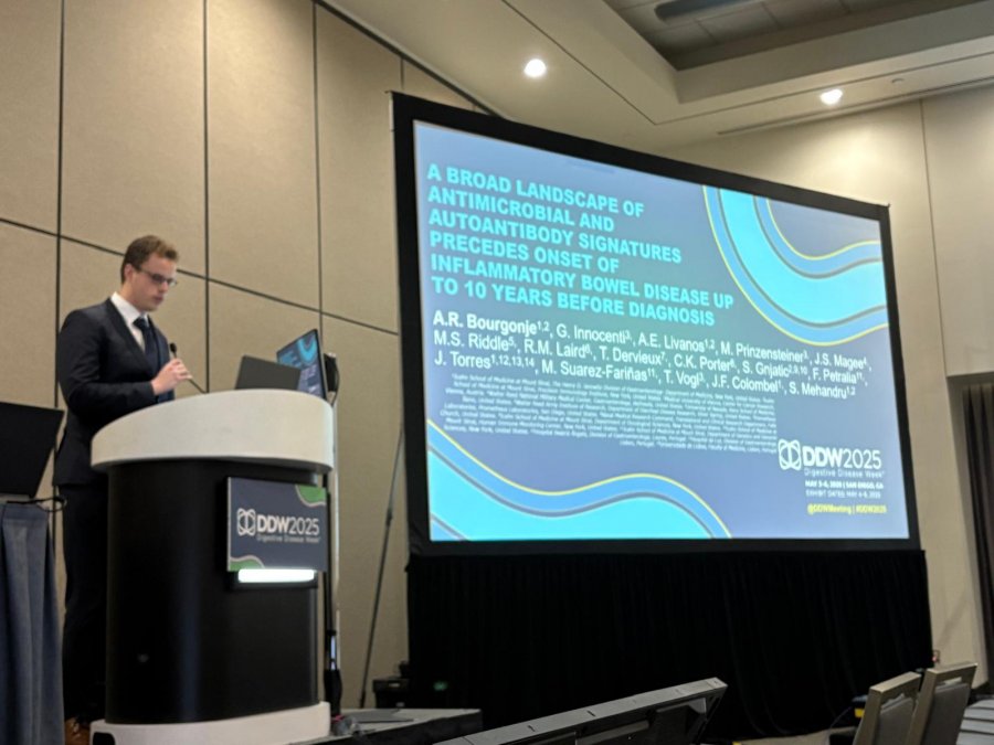 Dr Arno Bourgonje, a postdoctoral fellow from INTERCEPT partners Icahn School of Medicine at Mount Sinai and University Medical Center Groningen, gave a presentation in the AGA Basic Science Plenary Session focused on pre-clinical antibody repertoires detectable up to 10 years before a Crohn’s diagnosis making it possible to predict an IBD diagnosis with high accuracy. His presentation entitled Broad landscape of antimicrobial and autoantibody signatures reveals selective reactivity in the pre-clinical phase of Inflammatory Bowel Disease adds compelling evidence to the idea that preclinical immune system perturbations occur long before patients report their first symptoms – a foundational insight for INTERCEPT’s approach. For his research, Bourgonje collaborated with other researchers from Icahn School of Medicine at Mount Sinai, Hospital da Luz and Prometheus Laboratories Inc, all partners of the INTERCEPT project.
